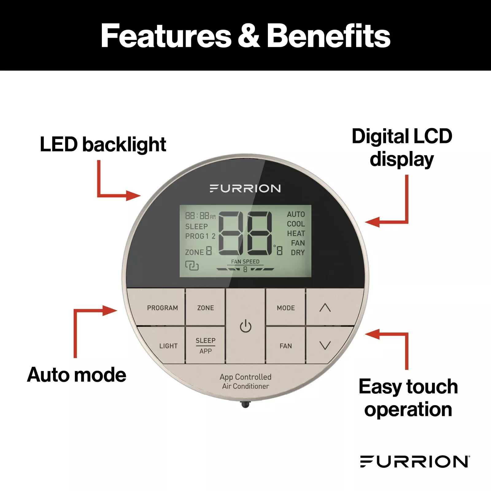 This thermostat is designed and tested to withstand the vibrations, shocks, and rigors of travel, ensuring long-term reliability on the road. It is also designed to operate smoothly in a wide range of temperatures. This is made possible by Furrion's innovative Climatesmart and Vibrationsmart technology.